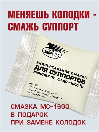 Смазка MC-1600Универсальная смазка для суппортов и колодокНаучно-производственная компания VMPAUTO в этом году разработала и произвела первую универсальную смазку для суппортов отечественного производства. На мировом рынке продукт не имеет аналогов близких по характеристикам. До этого не существовало ни одной смазки, которая одинаково хорошо применялась бы для направляющих, колодок, поршня, резиновых манжет и пыльников.